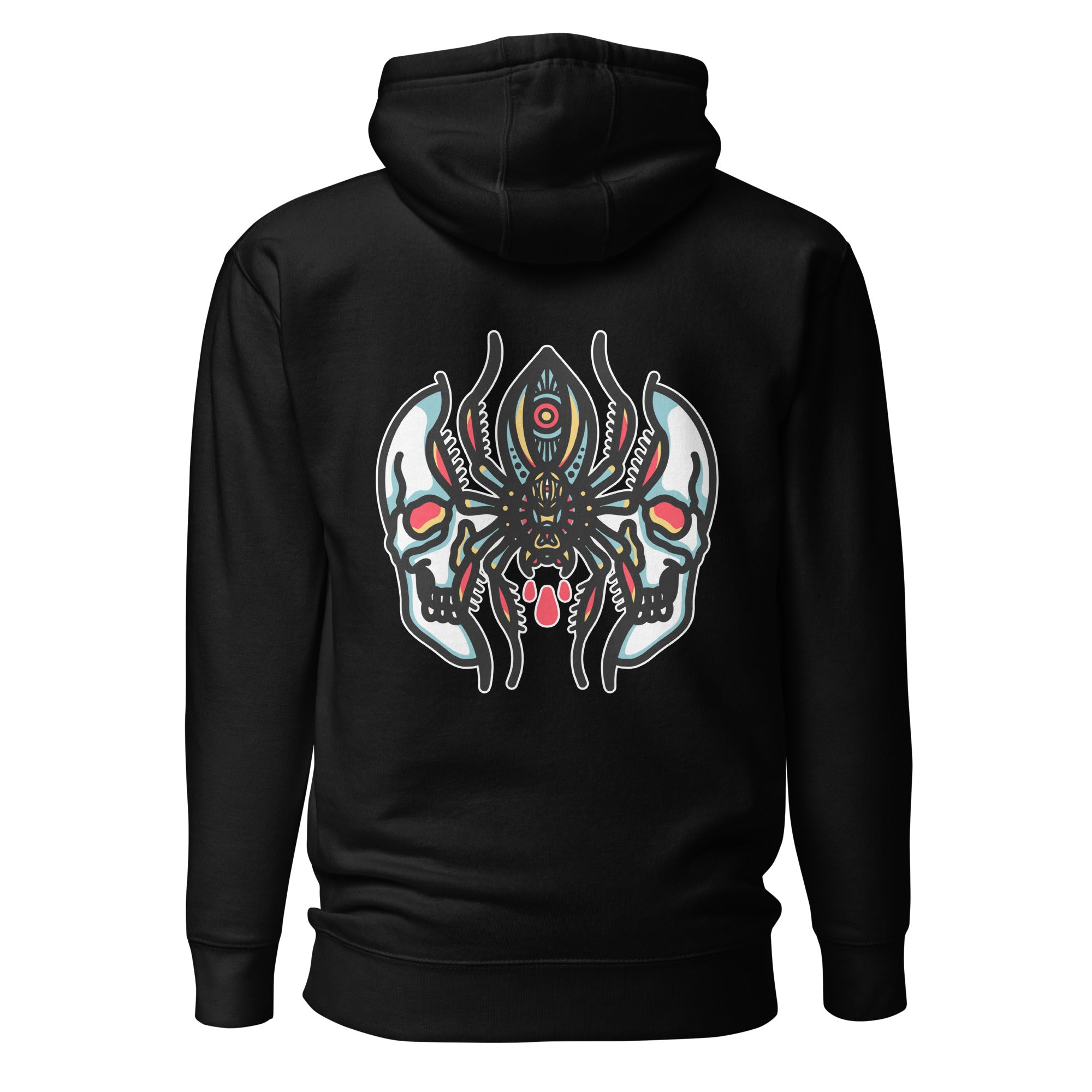 Skull Spider Hoodie featuring a bold graphic design combining a skull and spider artwork for a dark, eye-catching streetwear look. This hoodie blends alternative graphic style with comfortable everyday wear.
